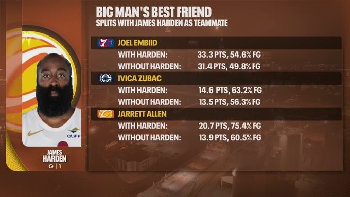 恩比德:与哈登搭档时: 33.3分,投篮命中率54.6%无哈登时: 31.4分,投篮命中率49.8%祖巴茨:与哈登搭档时: 14.6分,投篮命中率63.2%无哈登时: 13.5分,投篮命中率56.3%阿伦:与哈登搭档时: 20.7分,投篮命中率75.4%无哈登时: 13.9分,投篮命中率6...